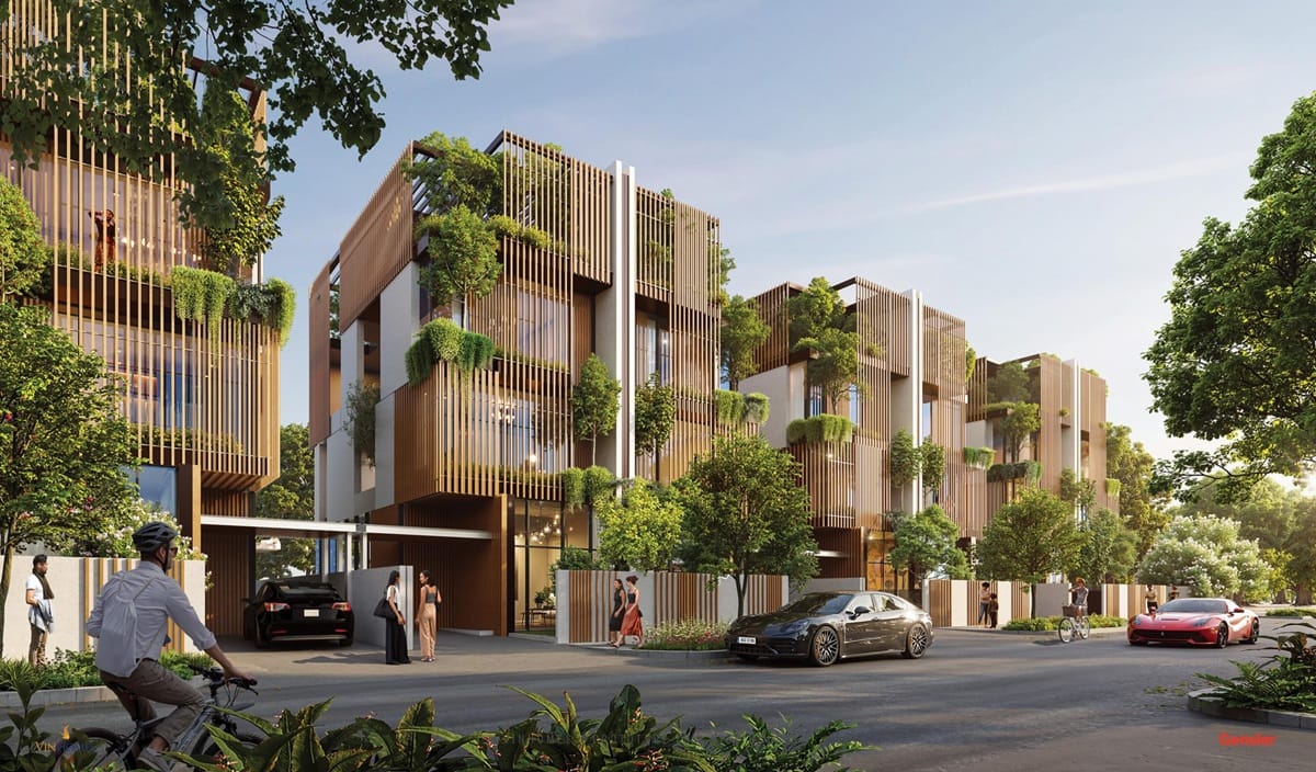 Khu đô thị sinh thái ven sông với biệt thự, shophouse, căn hộ cao cấp đan xen mảng xanh và mặt nước.
